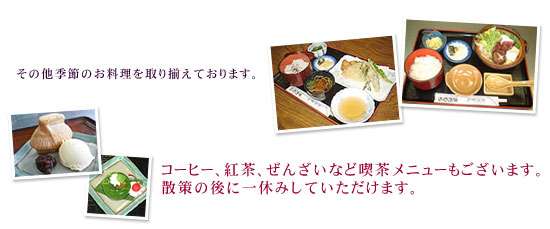 地元の食材を使い四季の味をご提供いたしております。こだわりの商品として手打ちそばをご提供いたしております。美山産のそば粉を使い、そば本来の味を引き出すよう心がけ、職人たちが心をこめて美山のおいしい水を使い打ち上げます。